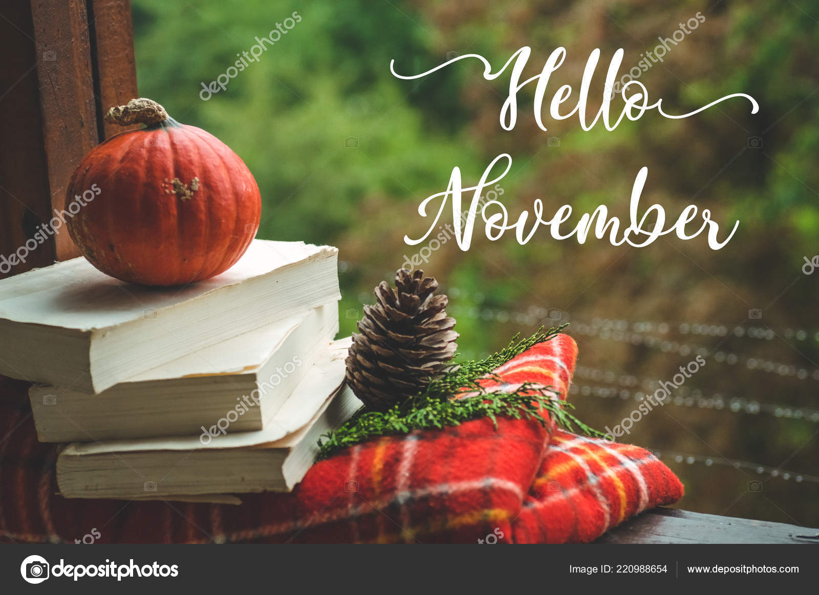Hello November Cozy Autumn Still Life Cup And Opened Book On Vintage Windowsill With Red Blanket Pumpkin Candles Autumn Rain Stock Photo By C Nastyaofly 220988654
